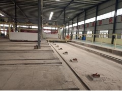 蒸养完成的加气混凝土板材由出釜子母摆渡车上的子车牵引出釜,牵引到摆渡车位置后由脱钩器分离,将一车成品牵引到摆渡车上,后摆渡到回车道位置,子车将一车成品推到成品吊具位置,子车返回到摆渡车上,成品吊具将蒸养车上的板材吊到掰板机位置,掰分完成后由单模成品夹具夹到链条上打包,打包完成后在堆垛厂堆放。