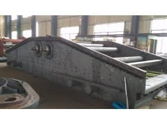 横梁是振动筛的关键部件。采用 20g板经机械剪切下料,用大型压力机整体压制成型,然后由两件组合形成矩形方梁,两端焊上方形法兰,经工频炉退火处理,消除焊接压力。法兰两端面经专用铣床加工,以保证两端面的平行度和光洁度,减小其与筛邦联结之间的缝隙,保证筛机整体强度。横梁上敷设护梁板,防止物料对横梁的直接冲击磨损,护梁板应由耐磨材料制成,更换方便。