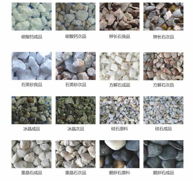 非金属矿:钾长石、石英石、滑石、磷矿、方解石、白云石、红柱石、萤石、蛭石、云母、膨润土、高岭土、重晶石、长石、石英、碳酸钙、鹅卵石、冰晶石、石榴子石、石灰石、锰矿石等.