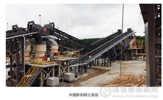 BLUE STONE骨料加工厂的破碎筛分设备主要包括:JC1100颚式破碎机二台、CC300S液压圆锥式破碎机二台、CC300MF液压圆锥破碎机二台,VS1500立轴破碎机二台、YKR3075振动筛四台。