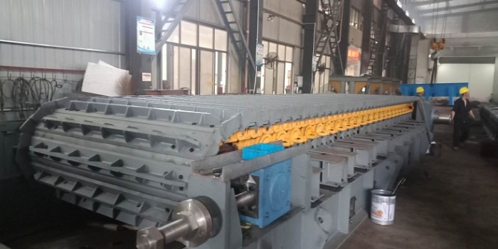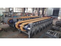 座部件由机架和支承件组成。机架由钢材焊接而成,支承部件有支重轮、下托轮和纵向导轨,输送板得到支重轮和纵向导轨的双重支持,使支重更均匀合理。牵引链基本上不受矿石和自重产生的张力作用,支重轮外侧设计有凸台,与主、从动轮联合作用,成功地杜绝链轨跑偏。在机架下方设有下托轮,为方便维修,下托轮为侧装式。
